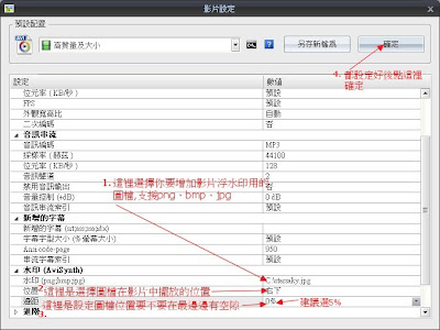 然後點水印(png;bmp;jpg),然後點旁邊的[...]選擇你要聽在影片的圖檔,支援bmp、png、jpg圖檔格式